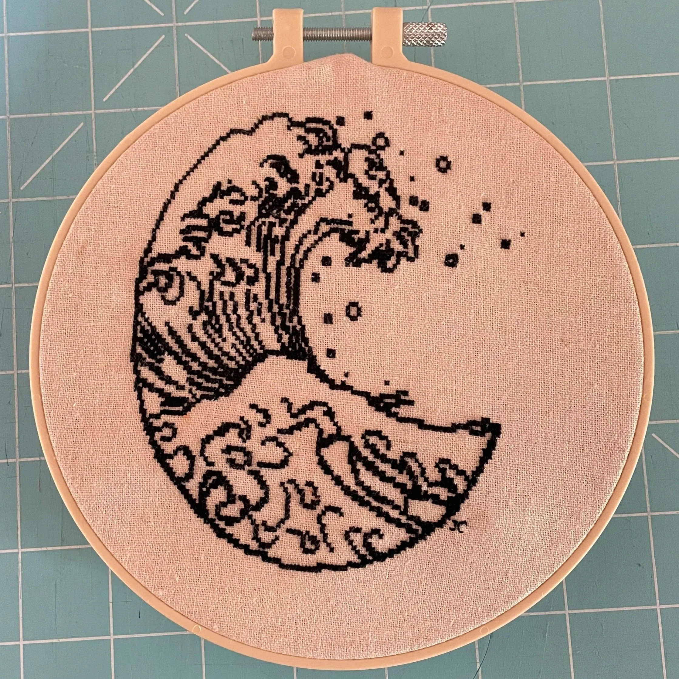 I finally finished the wave cross stitch! I started it back in last September when we took a trip to Hawaii. I didn’t have a hand sewing project so I just threw some DMC thread and some fabric in my suitcase and decided to pick out a project once I got there. Sitting on the beach, I decided to buy this pattern inspired by the famous woodblock print “The Great Wave off Kanagawa”, but omit the mountain in the background. It was only $2 from Etsy by CrossStitchFoxy and gave me a quick fix to my fingers itching for a project.