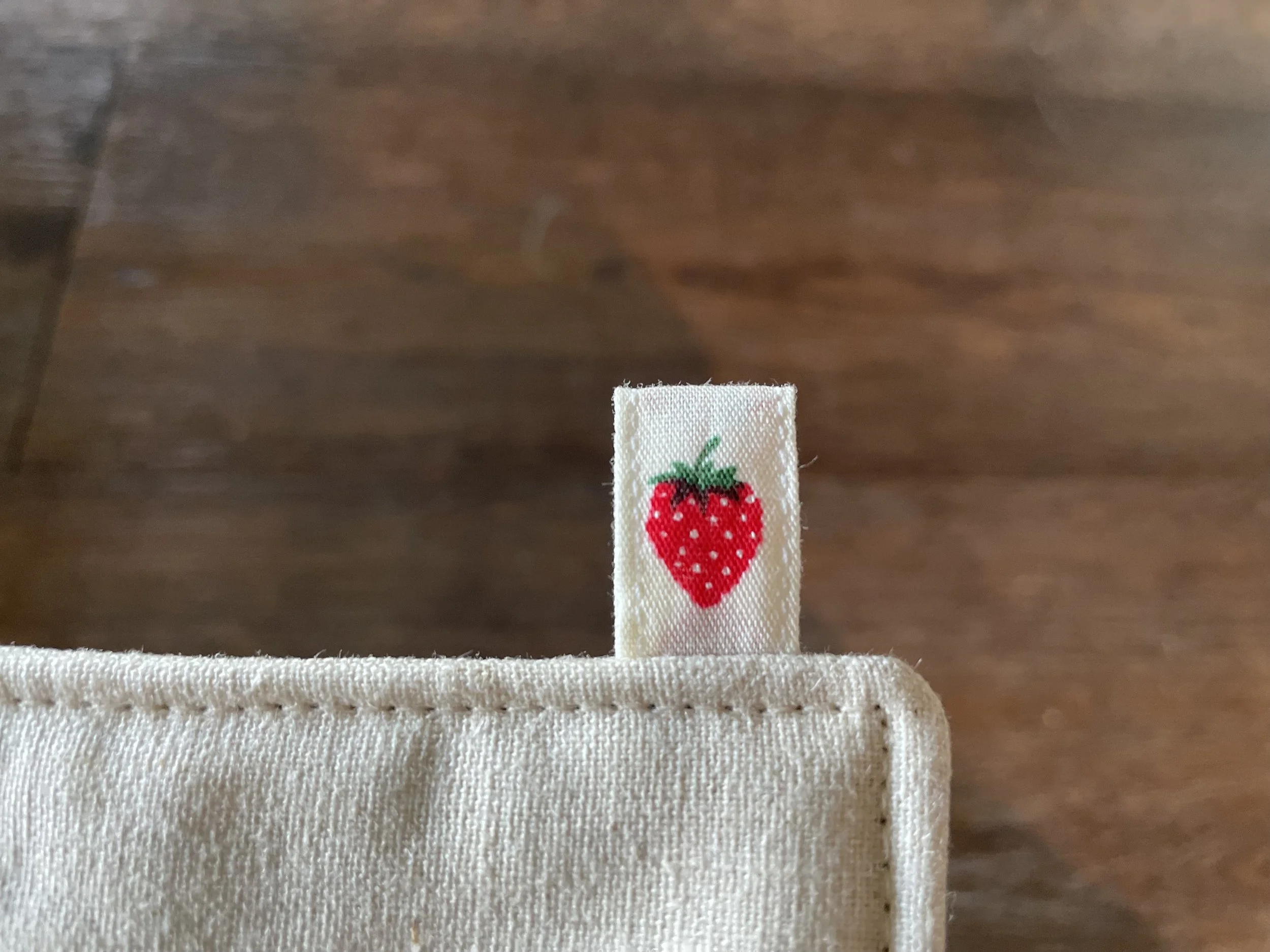 Isn’t that little strawberry label adorable! I was mourning my lack of suitable labels for this project when I realized I have a whole quarter yard of this perfectly scaled strawberry print. I just cut out a little strip, folded the sides in and sewed along the edge. Perfect!