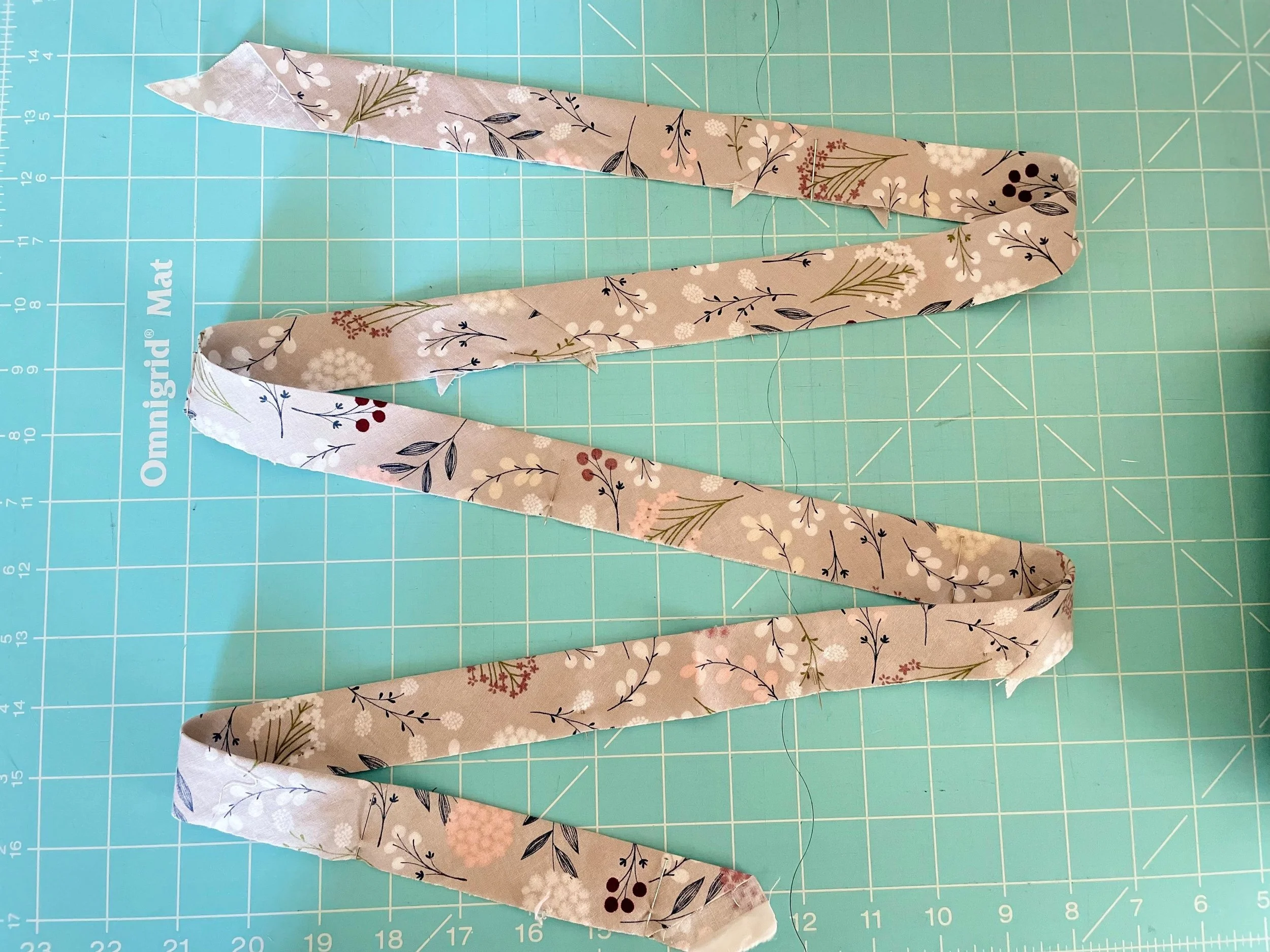 3. Make the bias binding. Using a ruler with a 45 degree line, cut four 2.5” strips on the bias of your binding fabric.