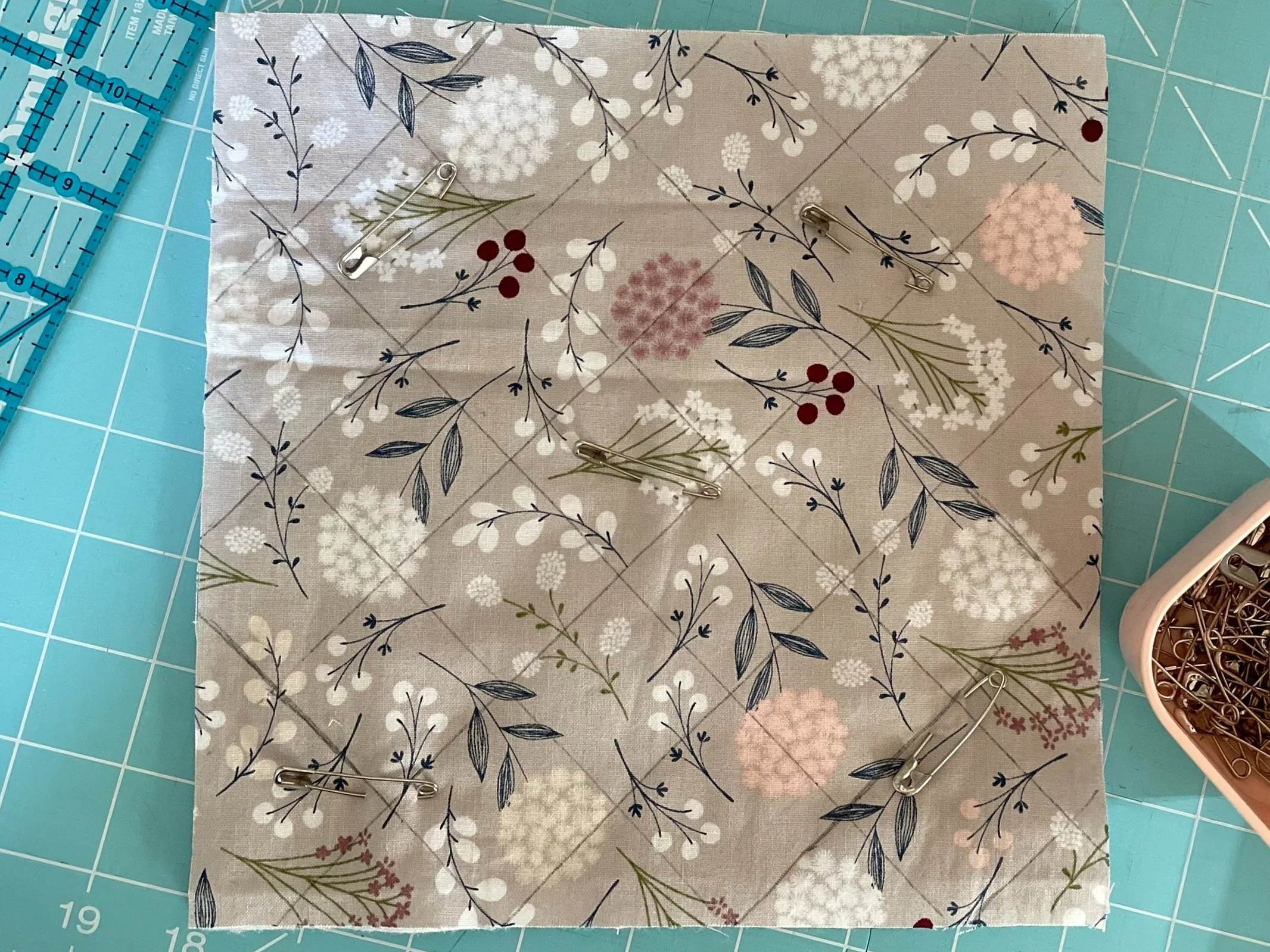 5. Mark lines. Using water soluble ink, a Frixon erasable pen, a hera marker, or the dull side of a butter knife, mark lines on the diagonal across the top piece of fabric. I made my lines 1.5” apart. Then, mark lines the same distance apart going the opposite direction.
