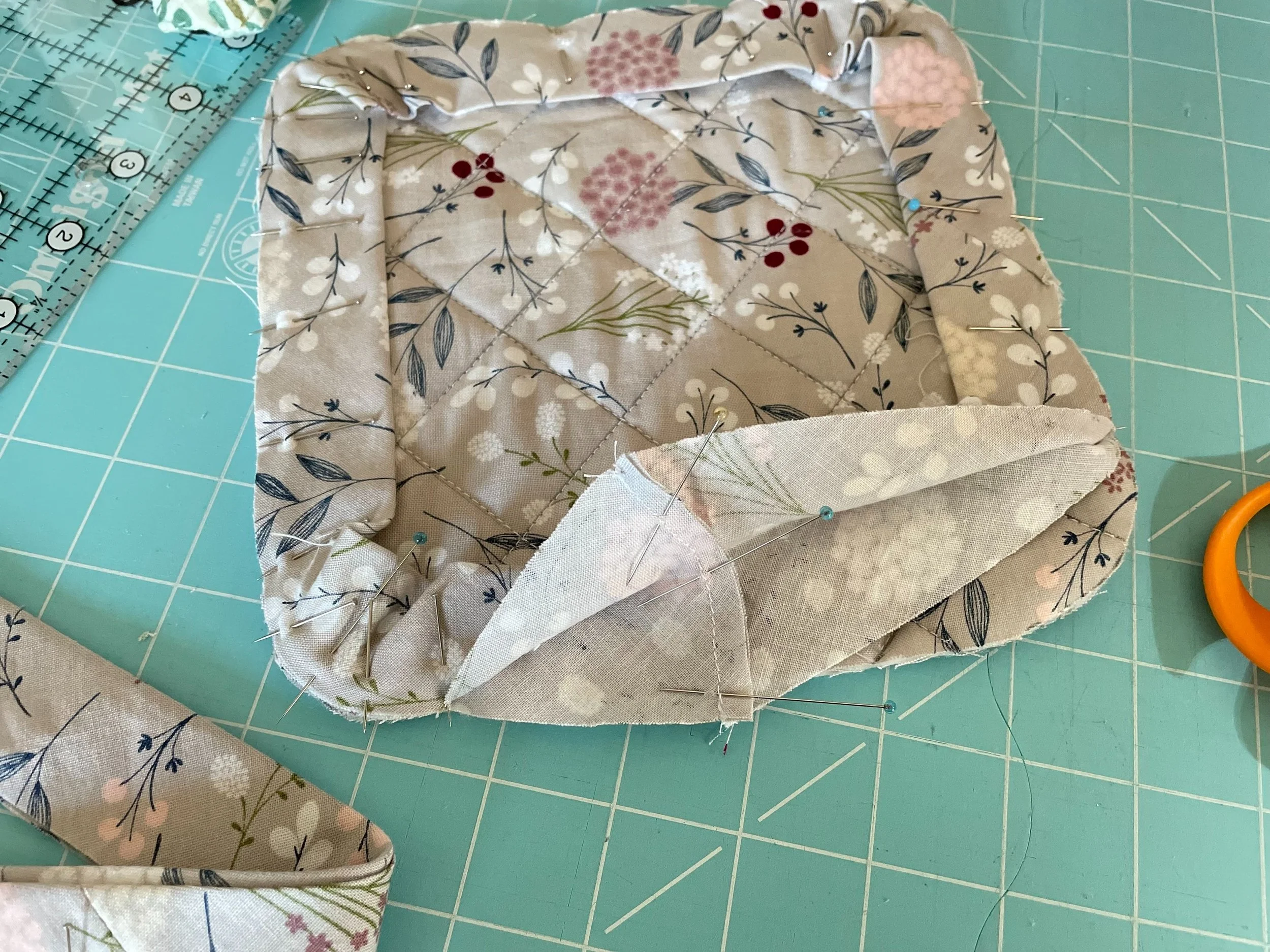 10. Attach binding. Take your folded-in-half bias strip and begin pinning it along the edge; the raw edge of the bias tape should be lined up with the raw edge of the potholder. Leaving about a 5” tail, put your first pin right before one of the corners. Then work your way carefully pinning around the whole pad, stretching the bias tape around the corners. Stop just after the 4th corner so you have one side of the square that is mostly unpinned.
